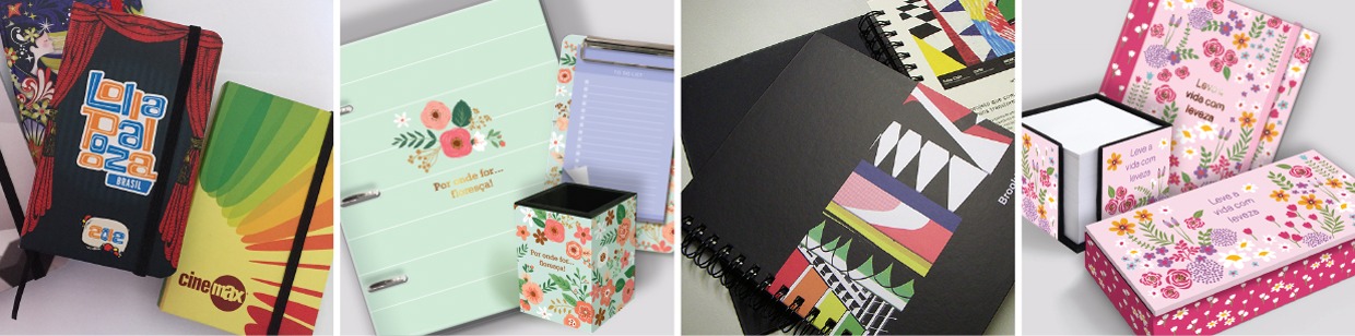 Customizamos os nossos produtos com estampas exclusivas e aplicação do logo da sua marca, como: cadernos, agendas, planners, fichários, cadernetas, porta-lápis, entre outros.